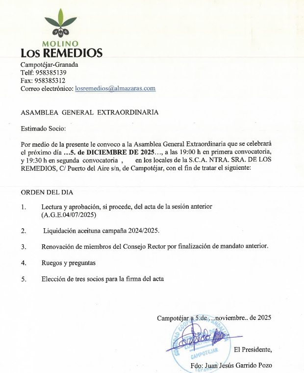 Estimado socio: Por la presente me dirijo a usted para informarle que, una vez transcurrido el mandato del Consejo Rector que presidio, se ha convocado la Asamblea General Extraordinaria en la que se llevara a cabo la elección del nuevo Consejo Rector que afronte la dirección de nuestra cooperativa. Adjunto se remite documentación complementaria en relación con la celebración de dicho proceso electoral. Sin otro particular, y esperando su participación, reciba un cordial saludo. En Campotejar a 5 de Noviembre de 2025.